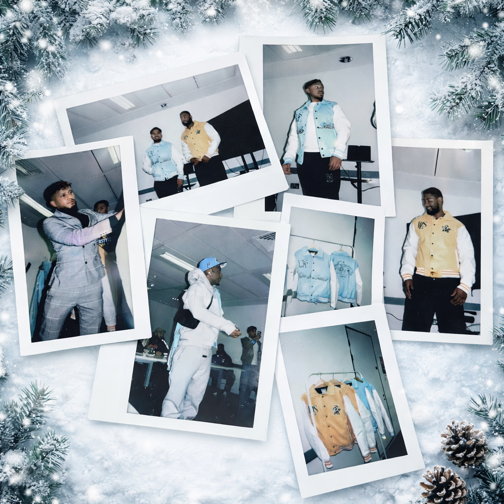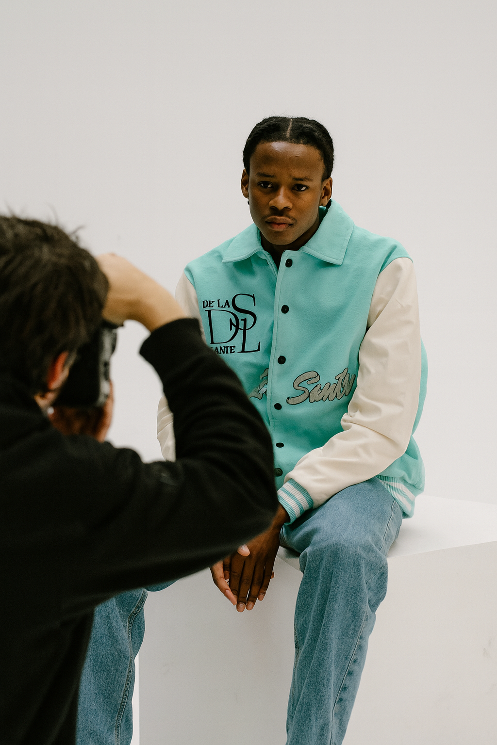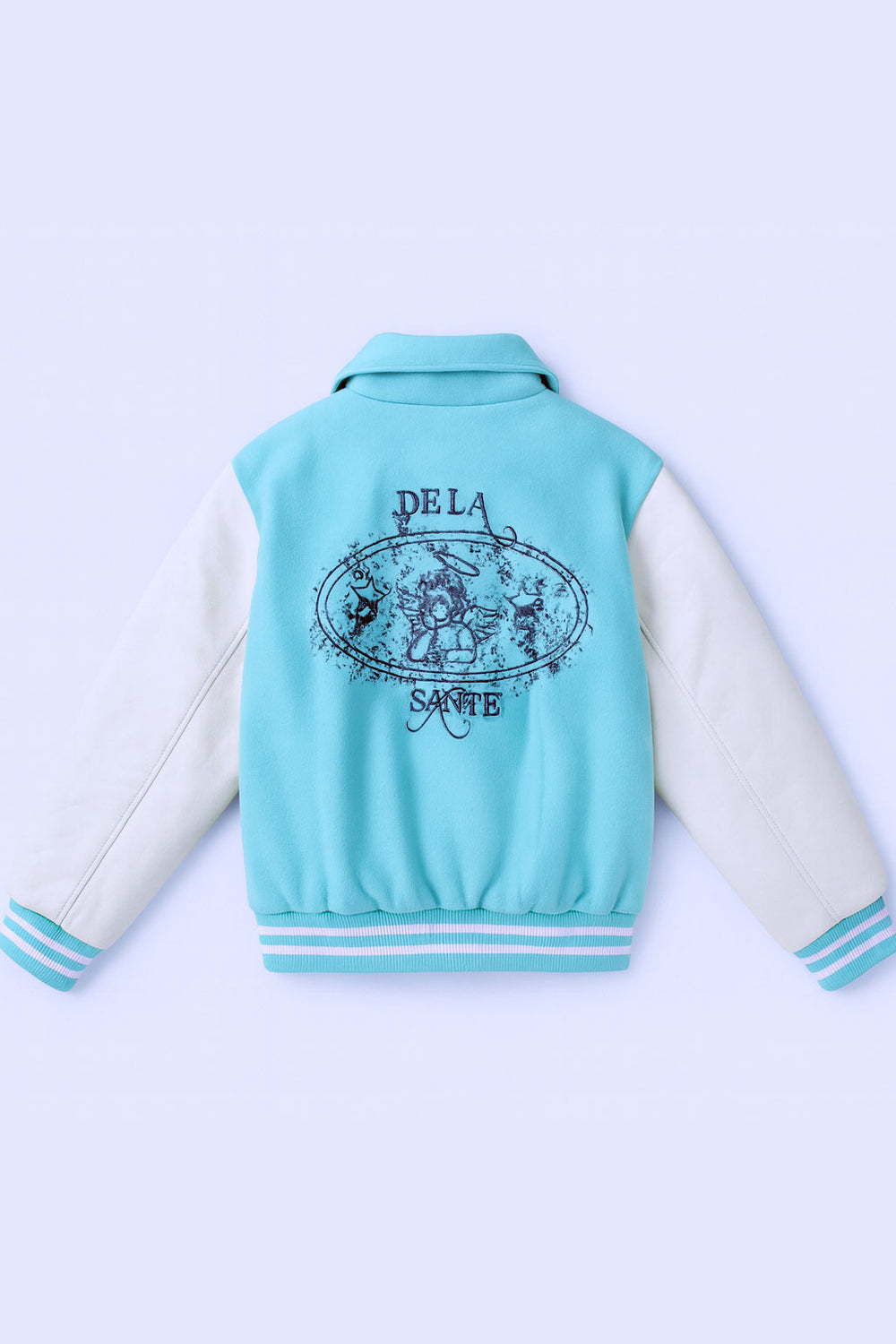 An impeccably crafted varsity jacket featuring a sky-blue wool body and supple real leather sleeves, elevated with bespoke De La Santé embroidery and intricate signature detailing—an expression of modern luxury and refined artistry.